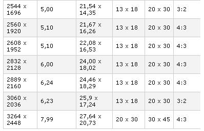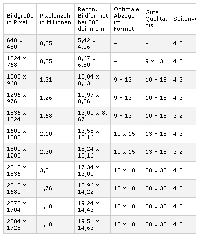 Aus der folgenden Tabelle können Sie ablesen, bis zu welchem Format Abzüge oder Ausdrucke bei einer bestimmten Bildgröße optimale bzw. noch gute Qualität aufweisen